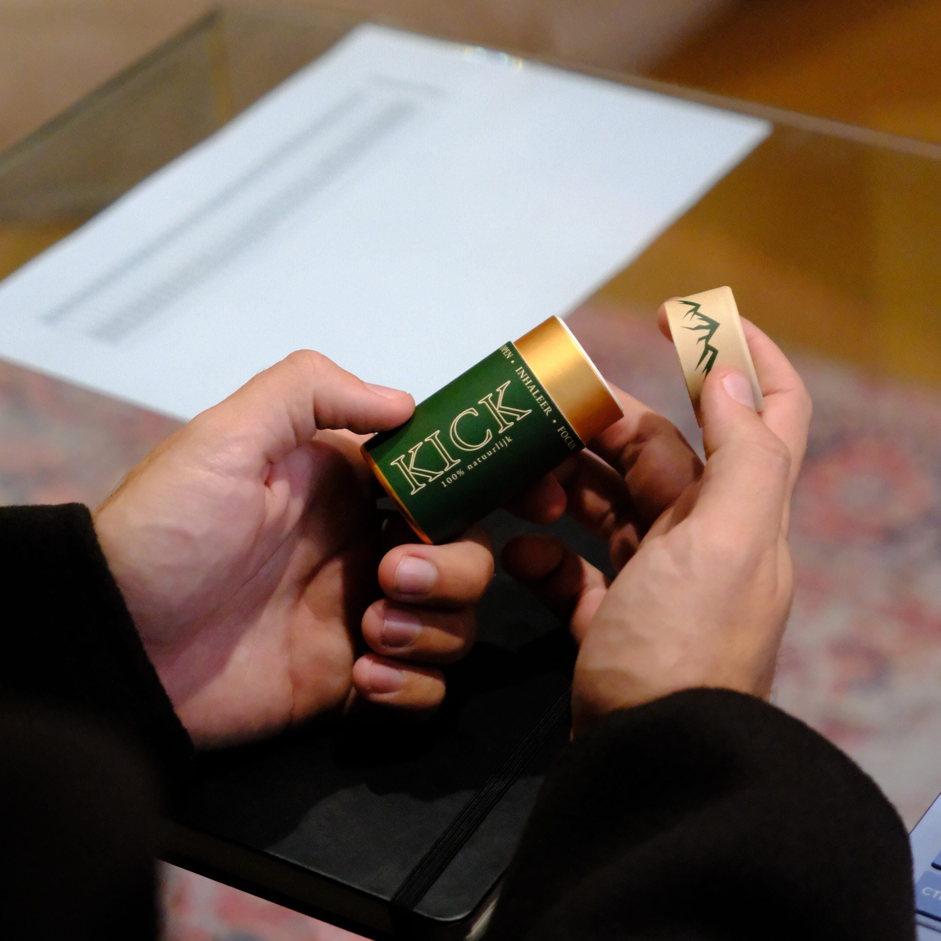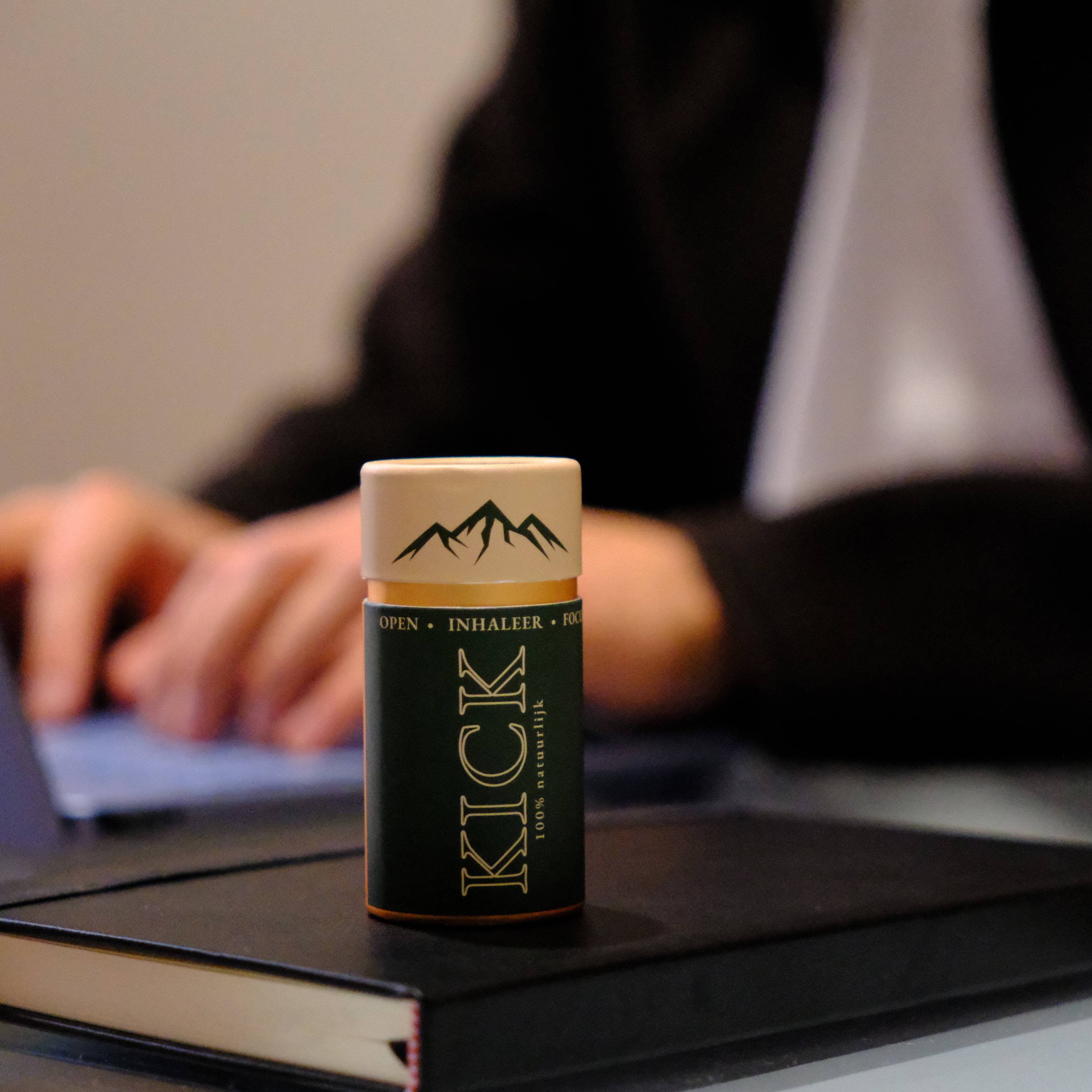 Kick is een natuurlijke aromatische inhalator die gebruikmaakt van geurbeleving om je aandacht terug te brengen naar het moment. De mix van kruiden en menthol prikkelt je zintuigen en creëert een fris, helder gevoel. Het is een korte reset die je helpt schakelen wanneer je hoofd vol zit.